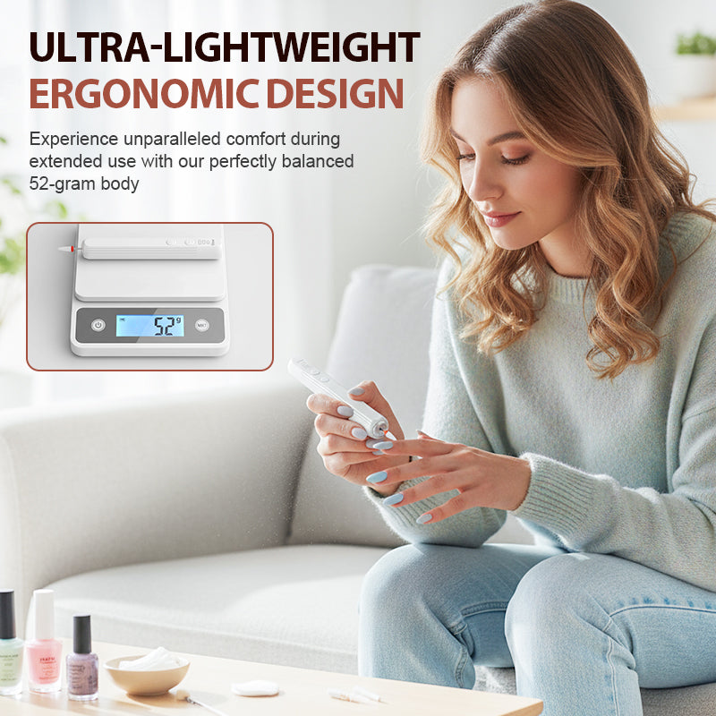 ULTRA-LIGHTWEIGHT ERGONOMIC DESIGN - Experience unparalleled comfort during extended use with our perfectly balanced 52-gram body. The contoured shape fits naturally in your hand, reducing muscle fatigue while providing optimal control for detailed nail art and precise filing motions, making intricate designs surprisingly easy to execute.